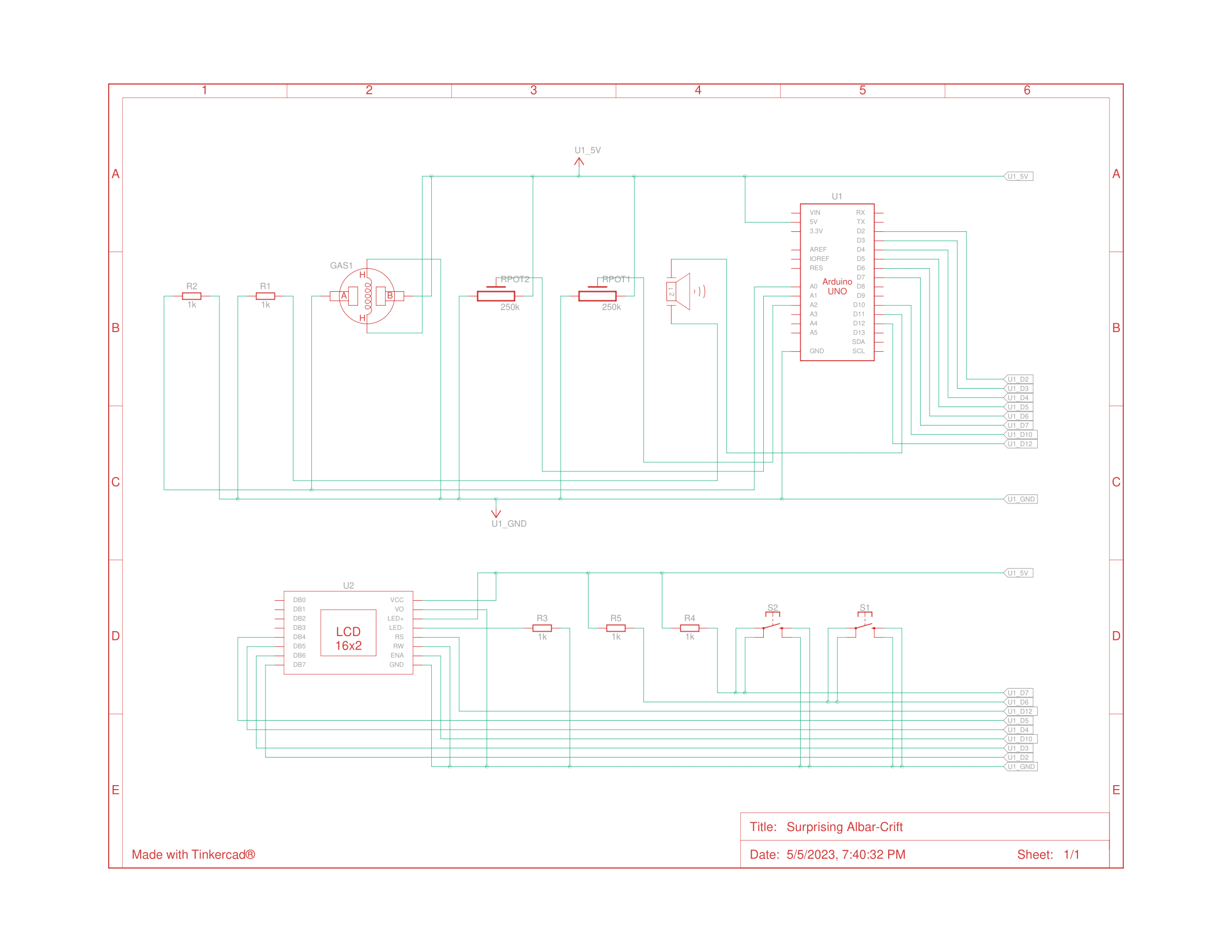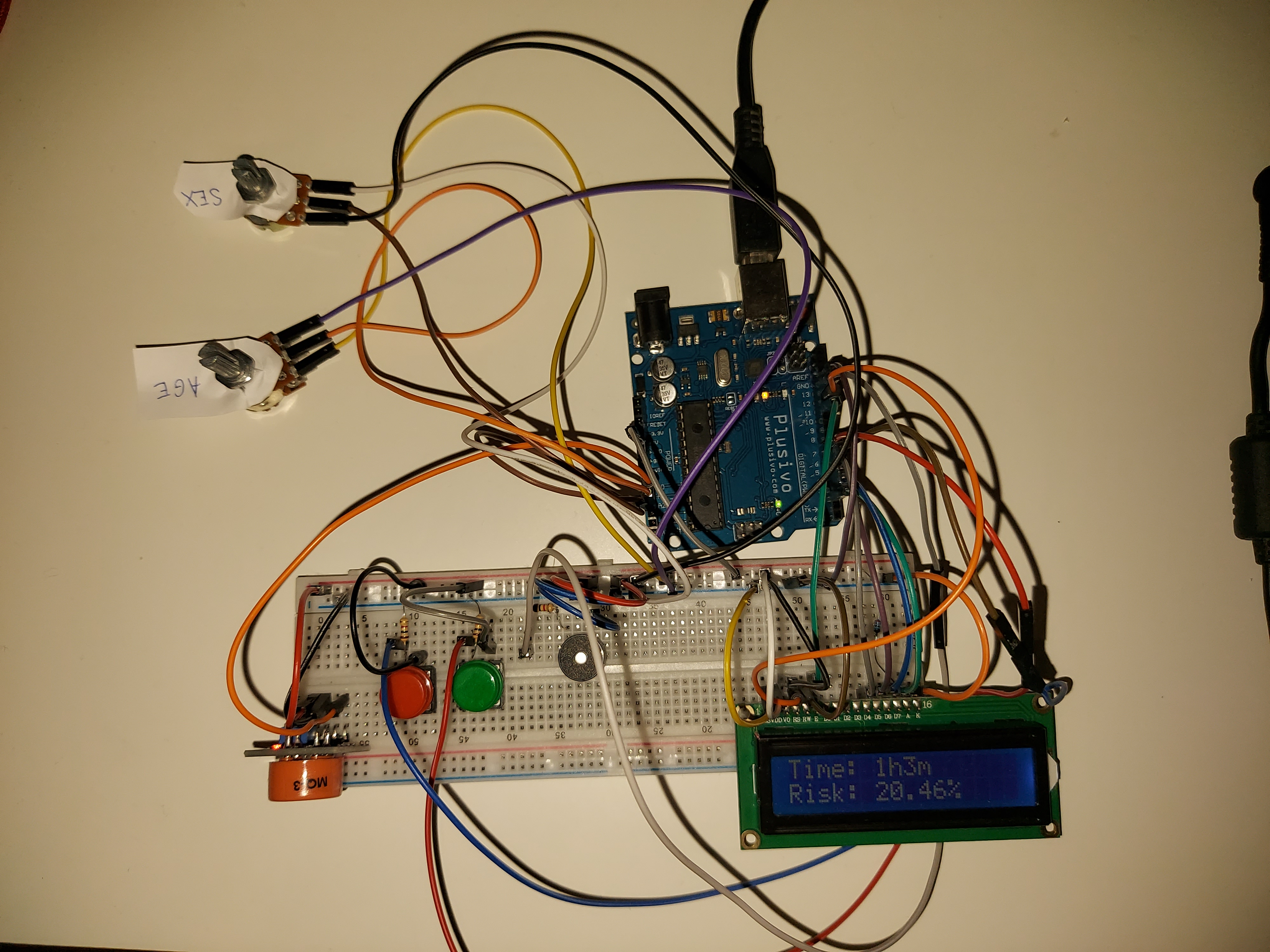 Ecranul este montat direct intr-un colt al breadboardului pentru ca este mai usor de urmarit daca este fix. Pe breadboard mai este montat buzzerul, butonul de reset (cel rosu), dar si cel utilizat pentru navigarea prin informatiile oferite de arduino pe ecran (cel verde). Potentiometrele sunt conectate la breadboard si arduino prin niste cabluri putin mai lungi, pentru ca fixarea acestora pe breadboard ar fi facut accesul la acestea, dar si la celelalte componente destul de dificil. Senzorul MQ-3 am ales sa il fixez tot pe breadboard pentru a fi cat mai stabil posibil, dar si o conexiune cat mai buna. Am incercat sa compensez utilizarea mai greoaie prin utilizarea unui cablu de conectare la laptop mai lung, dar si fixarea componentelor impreuna, pe cat posibil. In asamblarea componentelor, am utilizat o rezistenta de 220 Ohmi pentru ecranul LCD, dar si alte 3 rezistente pentru buzzer si cele doua butoane.