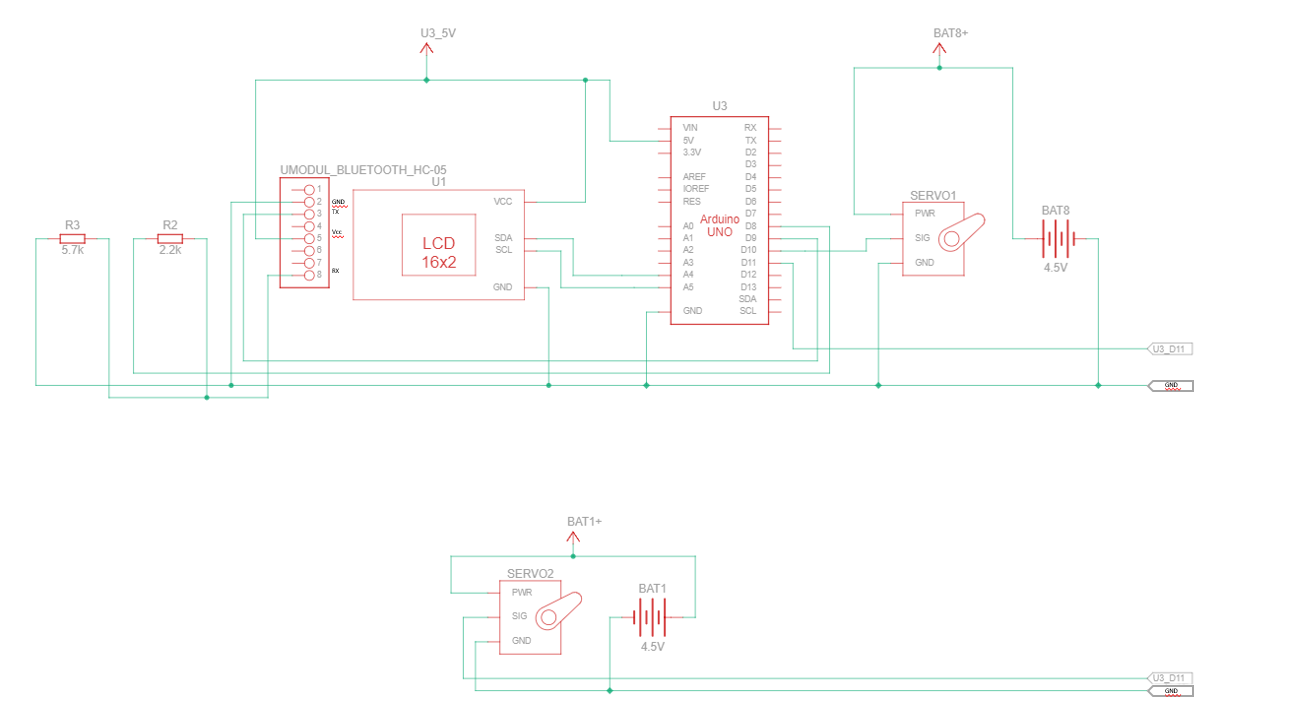 Prin intermediul unei aplicatii de telefon minimaliste(facuta in MIT App Inventor) vom putea trimite comenzi de miscare a mainii: miscarea degetelor sau rotirea acesteia, catre placuta Arduino cu ajutorul modulului de bluetooth cu care microcontroller-ul comunica prin protocolul I2C, urmand ca placuta sa comunice cu LCD-ul(care va afisa comanda data de utilizator pe telefon) prin SPI si sa trimita semnale catre unul dintre cele doua motorase pentru a se realiza miscarea solicitata, de asemenea vor fi implementate anumite verificari astfel incat miscarea degetelor sa fie posibila doar intre niste unghiuri limita(de la 0 grade, in pozitia normala, la maxim 90 de grade) si rotirea mainii sa fie posibila intre 0 grade(pozitia normala) pana la 180 de grade(asa cum este si in realitate), in aceste cazuri limita se vor afisa si niste mesaje specifice pe LCD pentru a anunta user-ul ca limita miscarii respective a fost atinsa si sa incerce sa faca miscarea inversa.