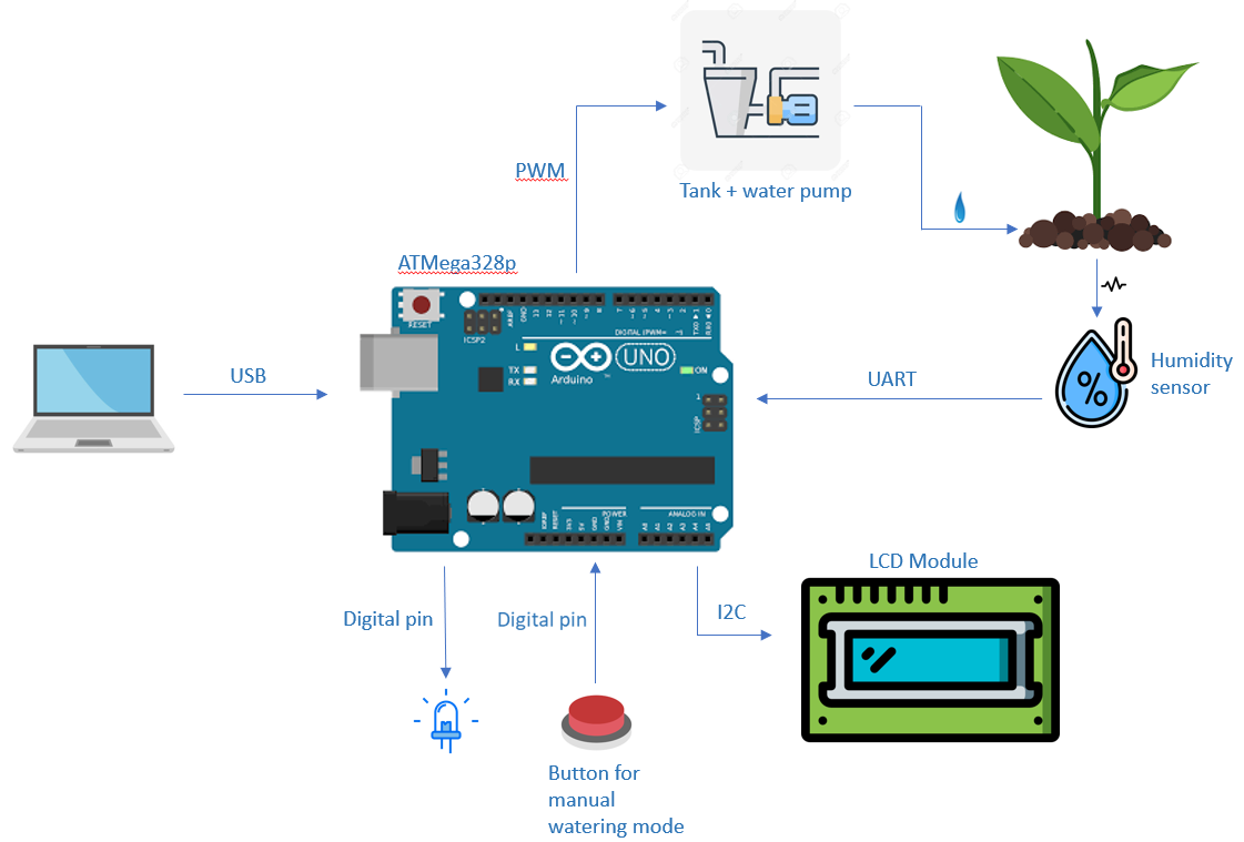 Pentru implementarea sistemului de ingrijire a plantelor, ma voi folosi de citirea periodica a unui senzor de umiditate din ghiveci. Cand umiditatea va scadea sub un anumit prag, pompa de apa se va activa si va uda planta pana la un nivel de umiditate potrivit. Totodata, va exista si optiunea de udare manuala a plantei, prin apasarea unui buton ce va activa pompa de apa si va uda planta cat timp butonul va fi actionat.