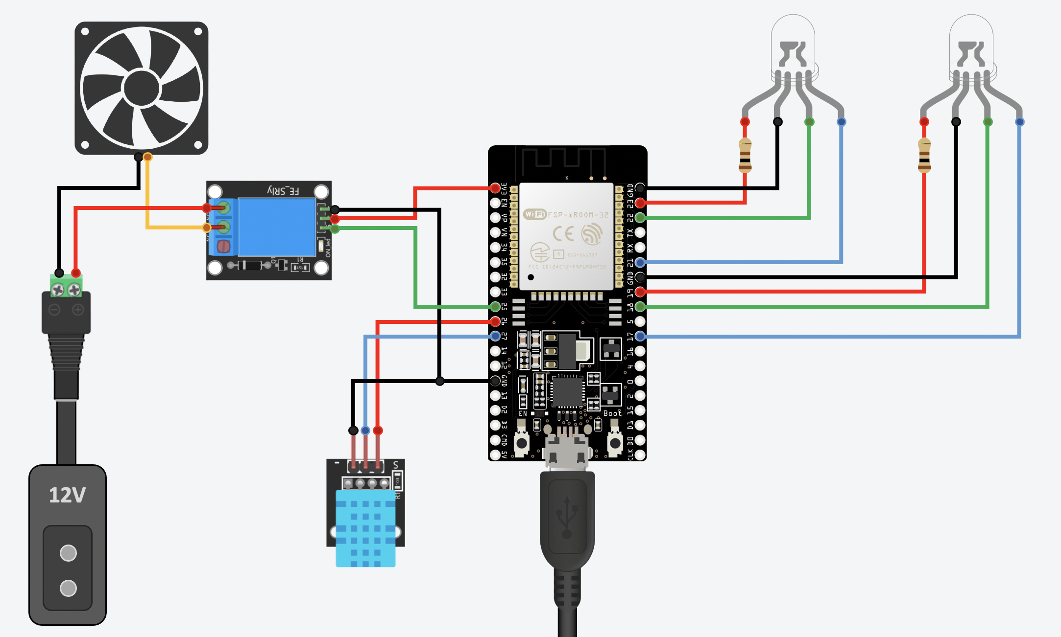 The ESP32 represents the core of the system. It controls the other components and also enables the network connectivity for the project. Because the fan requires 12V to function, I used a 12 power adapter which can be plugged intro a socket and a dedicated jack to accommodate the other end of the adapter. The relay module is needed in order to power the fan on and off. The DHT11 module is used for its temperature sensor. The idea behind this is that the fan should go on only if the temperature goes over a certain value, hence the need to read the temperature. The LEDs and the resistors are used for the lights of the system.