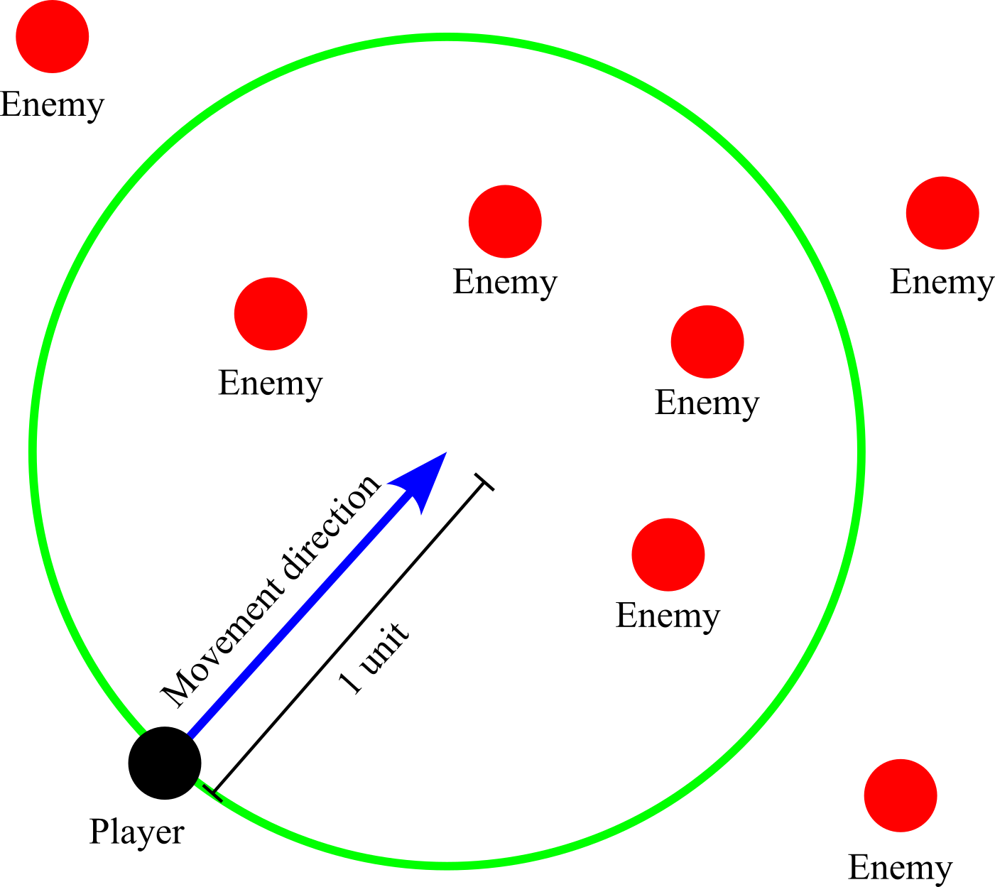 La apăsarea tastei space, personajul “trage” cu o “armă”, așa cum s-a menționat mai sus. Pentru a identifica inamicii care se află pe direcția de deplasare a personajului, la distanță mai mică de 2 unități, se poate folosi o abordare simplă ce oferă rezultate satisfăcătoare. Se utilizează un cerc virtual de rază 1, astfel ca diametrul să fie de dimensiune 2, ce se poziționează cu centrul la distanța 1 față de poziția personajului, pe direcția lui de deplasare. Această abordare este descrisă vizual în imaginea de mai jos.