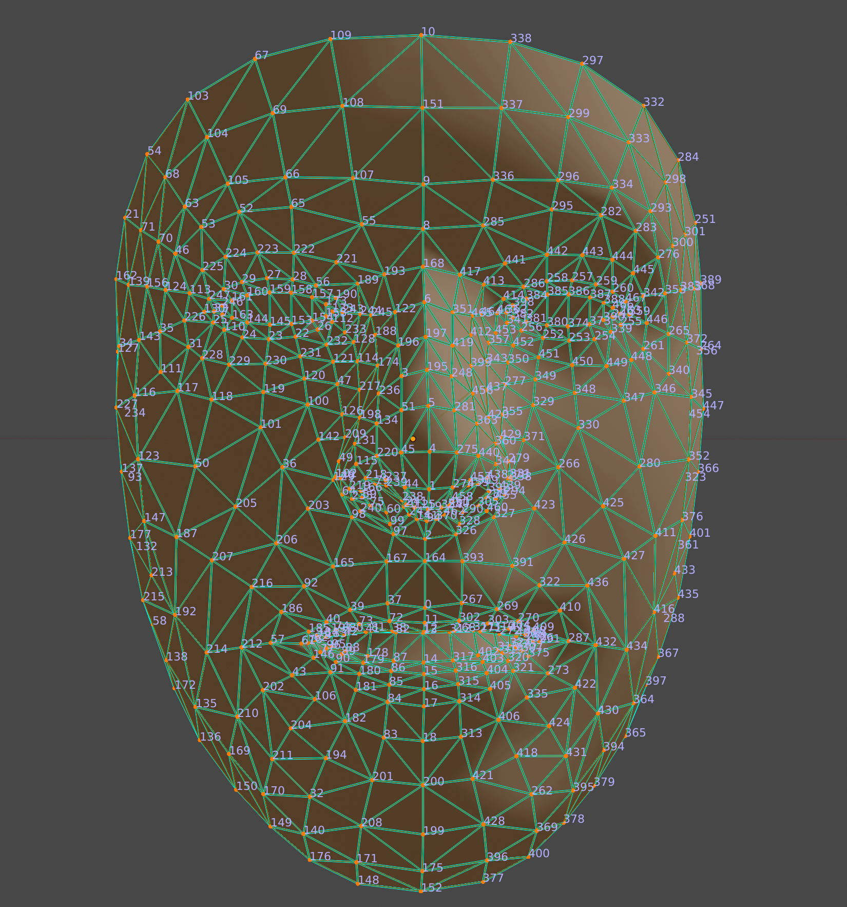 Un mesh 3D al feței: Alcătuită din 468 de vertecși, permite aplicarea de texturi detaliate și adaptabile care urmează cu precizie conturul feței.