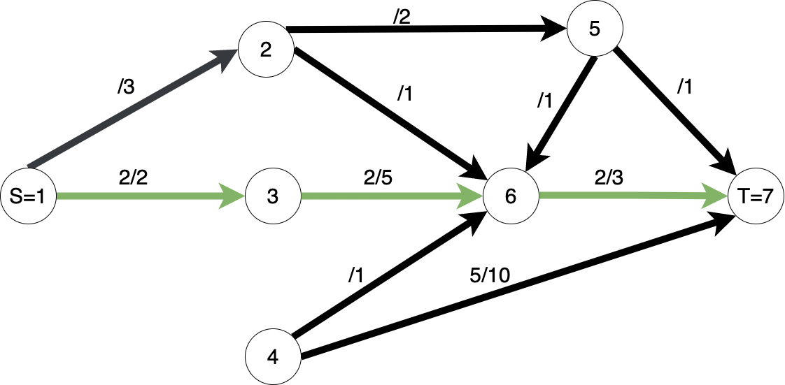 Arcul $(3, 6)$ are capacitatea $c(3, 6) = 5$ și fluxul curent pe acesta este $f(3, 6) = 2$. Pe desen notăm 2/5.