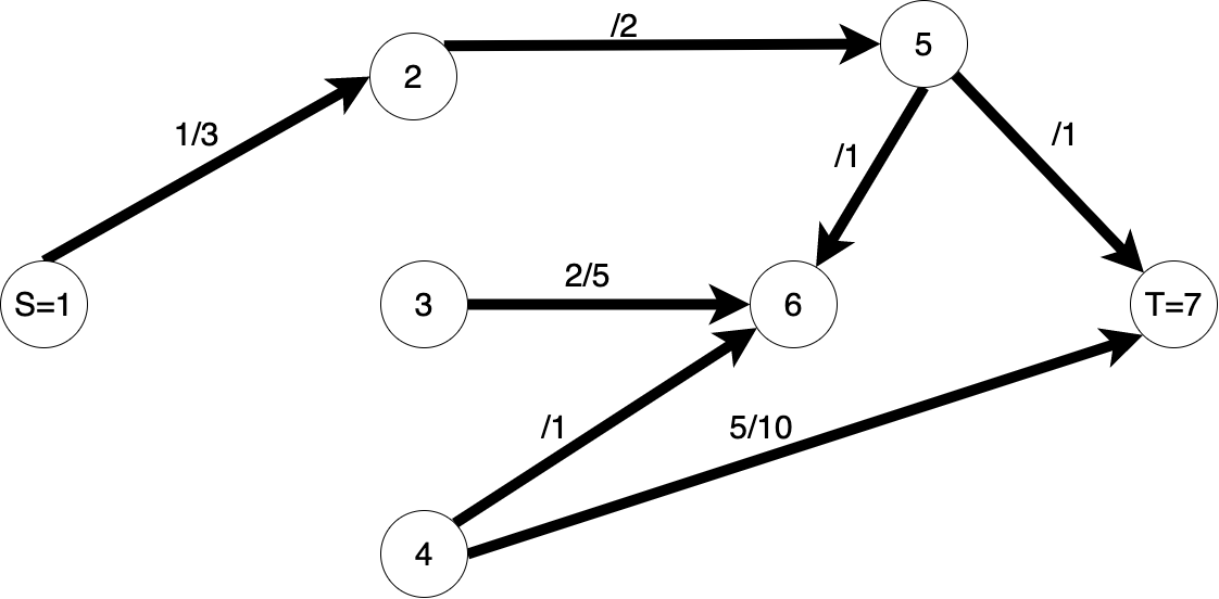 Arcul $(1, 2)$ are capacitatea $c(1, 2) = 3$ și fluxul curent pe acesta este $f(1, 2) = 1$. Pe desen notăm 1/3.