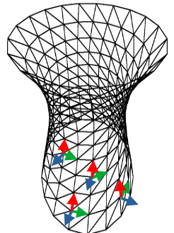 În figură ilustrăm cum se calculează normala unui vârf X. Săgeata roșie și verde reprezintă vectorii tangentă la suprafață. Ei se determină calculând direcția de la vârful X la vârfuri vecine. Normala - săgeata albastră - este produsul vectorial dintre săgeata verde și săgeata roșie (atenție la ordinea termenilor!).