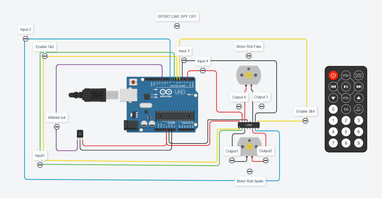 Fiecare motor are trei pini de control. Astfel, primul motor este controlat de pinii EnA, In1, si In2, iar motorul al doilea de pinii EnB, In3 si In4. Pinii En sunt conectati la nivelul logic 1 prin jumperi, deci prin program vom controla doar pinii In. Sunt disponibile următoarele combinatii: