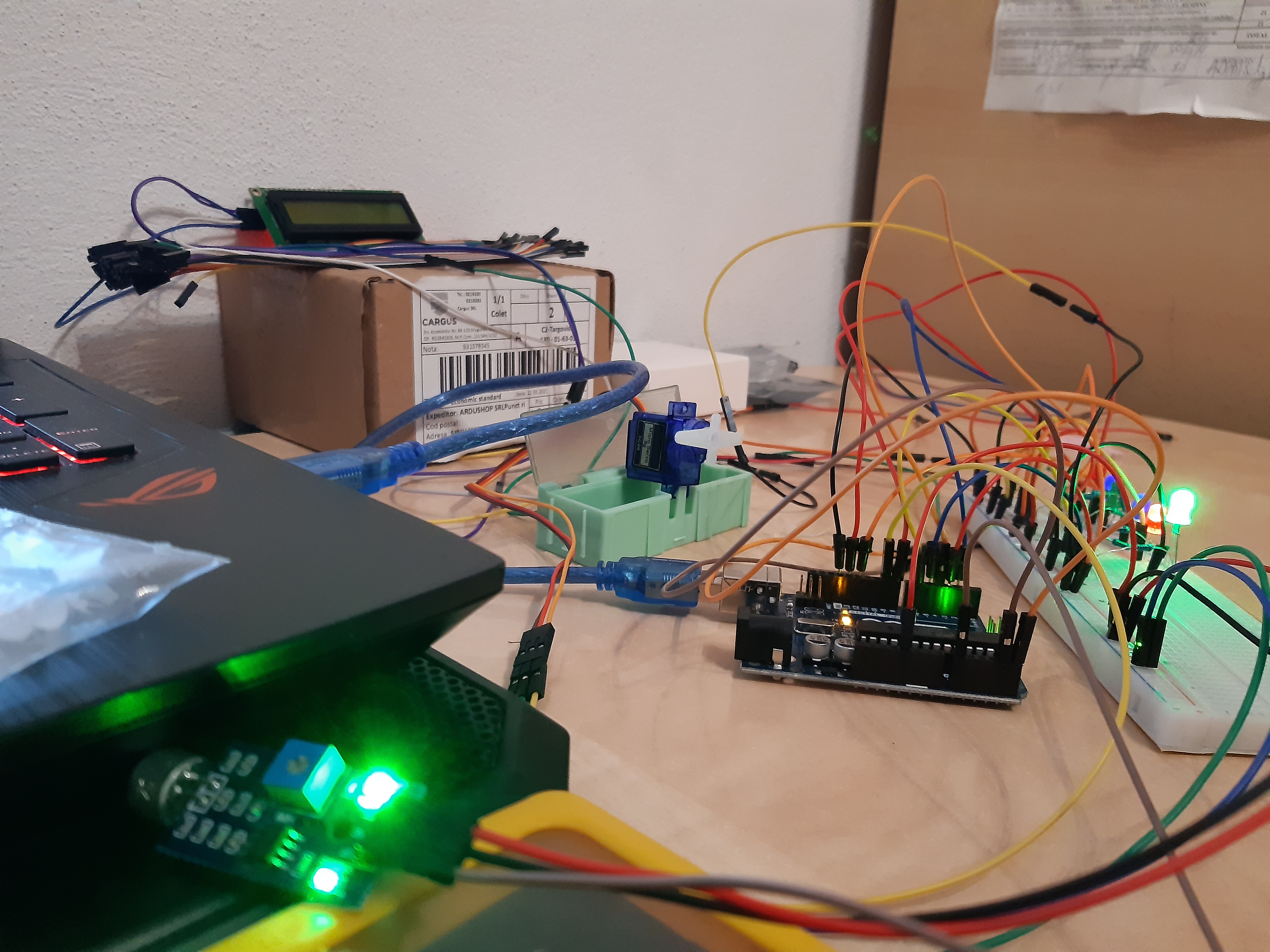 Aceasta imagine reprezinta placuta care conectam ledurile, servomotorul SG-90,senzorul de sunet care este conectat la pinul analog A0 si ecranul lcd I2C care este conectat la pinii A4 SI A5!