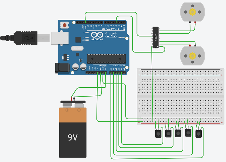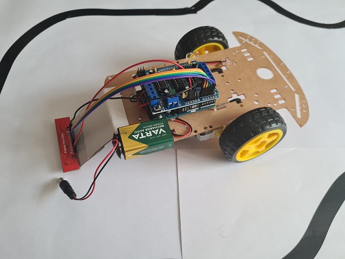 Astfel, placa de dezvoltare Arduino UNO primeşte informaţii legate de poziţia robotului de la senzorii cu infraroşu. În funcţie de aceste valori placa trimite mai departe informaţii către driver-ul de motoare L293D care acţionează cu viteze diferite cele 2 motoare (stângul, respectiv dreptul).