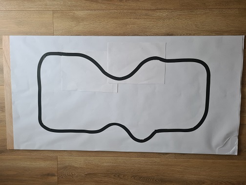 Circuitul a fost construit dintr-o placă de pal pe care am lipit cu scotch dublu adeziv o foaie de hârtie albă de 1m x 1m. Ulterior am lipit pe foaia de hârtie bandă izolatoare de culoare neagră pentru a crea un traseu sinuos.