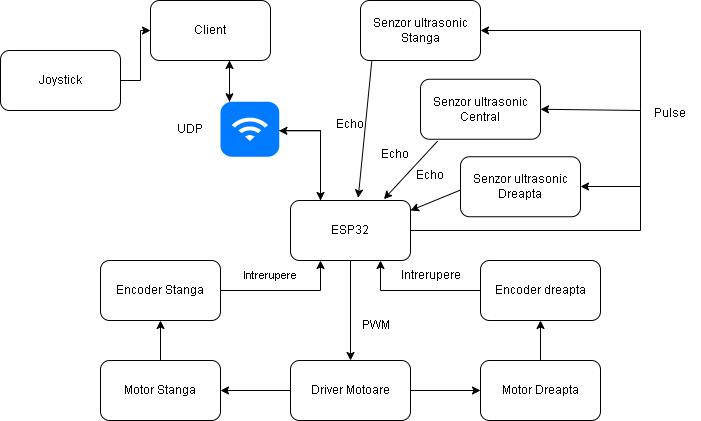 Robotul are capacitatea de a fi controlat si a transmite in timp real pozitia sa si pozitia obstacolelor pe care le detecteaza pe o retea WiFi. Localizarea este realizata cu ajutorul encoderelor de pe micromotoare, iar detectarea obstacolelor este facuta de trei senzori ultrasonici. Microcontroller-ul ce are la baza chip-ul ESP-WROOM-32 se ocupa pe de o parte de controlul si calculele de pe robot, cat si de comunicarea wireless, dubland ca un AP la retea.