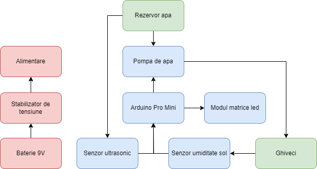 Senzorul de umiditate sol verifica nivelul de apa din pamant si produce o intrerupere in cazul in care nu aceasta nu este in parametri, iar placuta comanda pompa sa ude solul, afisand un mesaj pe matricea LED. Senzorul ultrasonic verifica nivelul de apa din rezervor si produce o intrerupere in cazul in care nu este suficienta apa, fiind afisat un mesaj pe matricea LED. In cazul in care totul este ok, matricea LED afiseaza un mesaj default.
