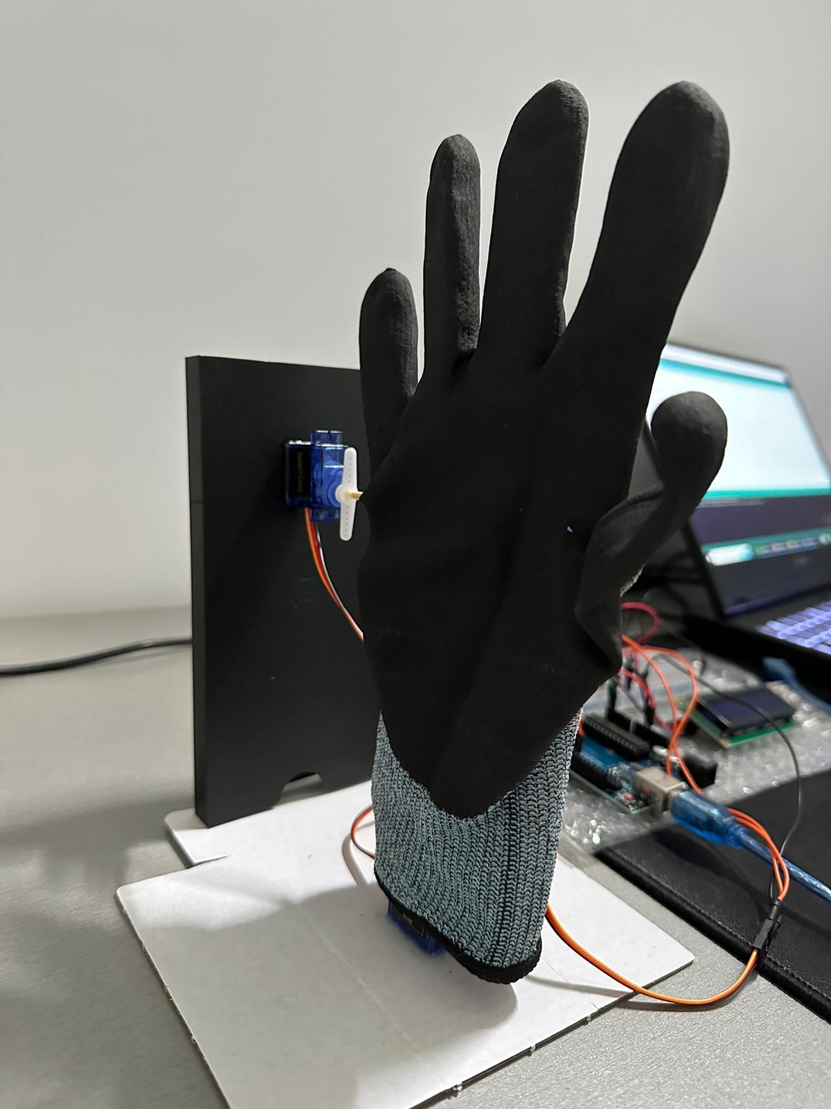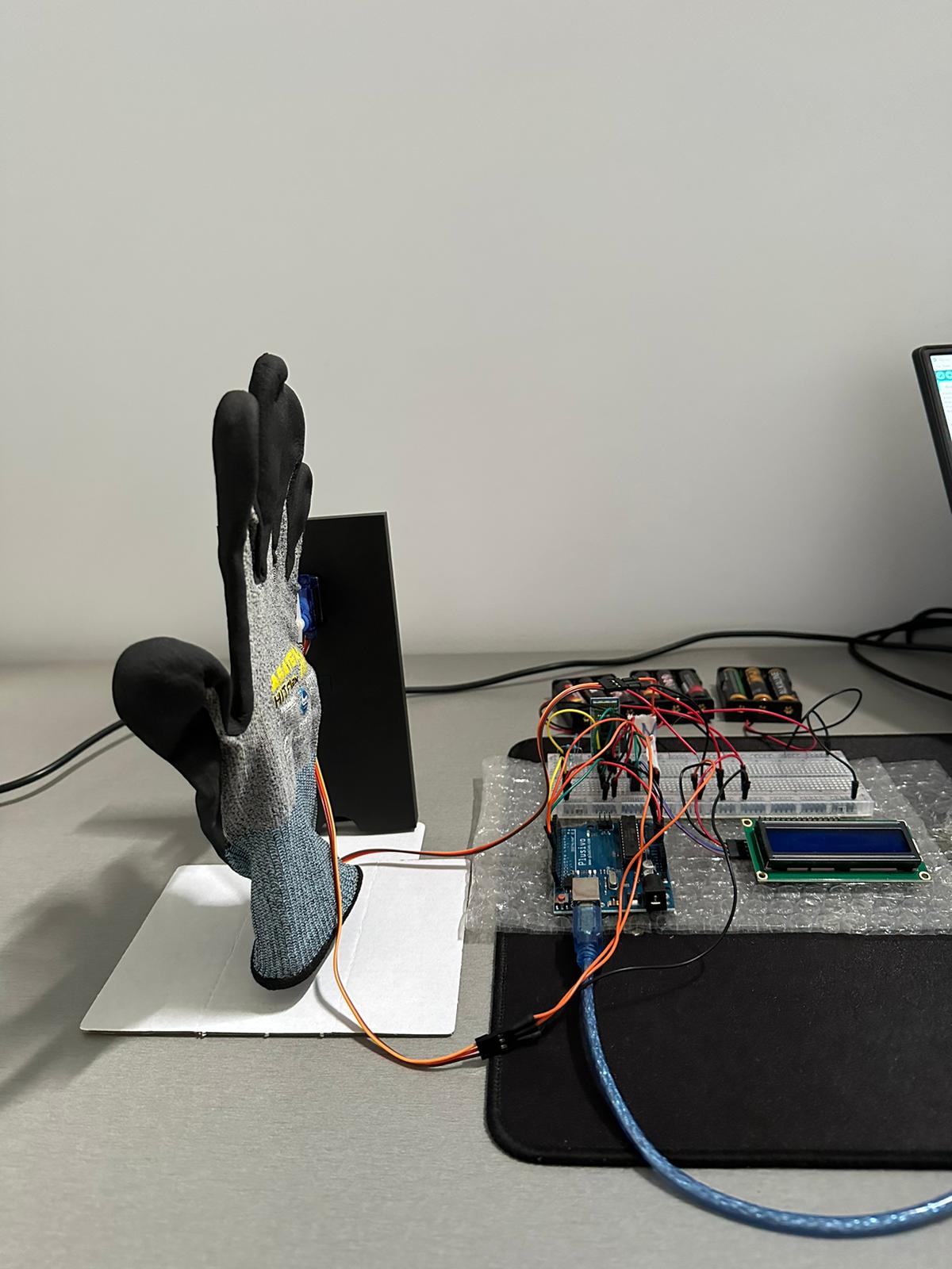 Prin intermediul unei aplicatii de telefon minimaliste(facuta in MIT App Inventor) vom putea trimite comenzi de miscare a mainii: miscarea degetelor sau rotirea acesteia, catre placuta Arduino cu ajutorul modulului de bluetooth cu care microcontroller-ul comunica prin protocolul I2C, urmand ca placuta sa comunice cu LCD-ul(care va afisa comanda data de utilizator pe telefon) prin SPI si sa trimita semnale catre unul dintre cele doua motorase pentru a se realiza miscarea solicitata, de asemenea vor fi implementate anumite verificari astfel incat miscarea degetelor sa fie posibila doar intre niste unghiuri limita(de la 0 grade, in pozitia normala, la maxim 90 de grade) si rotirea mainii sa fie posibila intre 0 grade(pozitia normala) pana la 180 de grade(asa cum este si in realitate), in aceste cazuri limita se vor afisa si niste mesaje specifice pe LCD pentru a anunta user-ul ca limita miscarii respective a fost atinsa si sa incerce sa faca miscarea inversa.