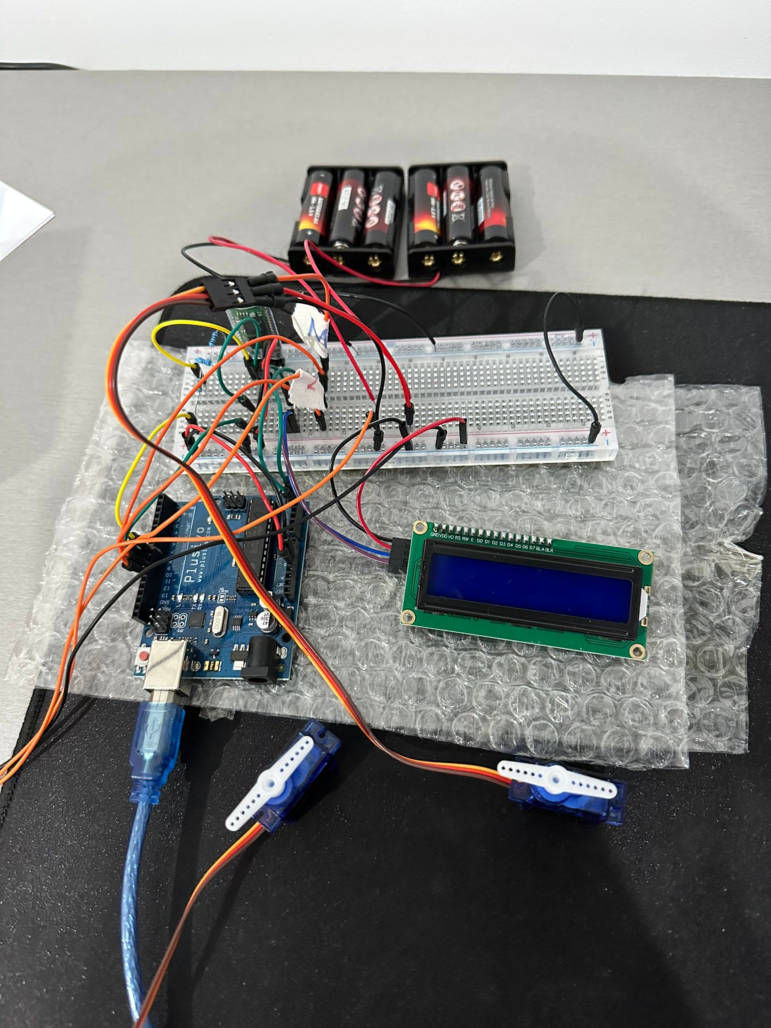 Realizarea proiectului a constat intr-o munca constanta pe parcursul mai multor zile, ca si probleme am avut in special la parsarea mesajelor primite prin Bluetooth, pentru ca uneori primeam mesaje incorecte datorita conexiunii si a durat ceva pana cand mi-am dat seama ca trebuie sa verific corectitudinea acestora. O alta problema intalnita a fost legata de timere, pentru ca incercam sa folosesc Timer1 pentru implementarea mea fara sa-mi dau seama ca acesta este folosit in spate de biblioteca Servo.h. Partea de design al proiectului, a fost destul de grea, dar in acelasi timp interesanta, sa iti imaginezi cum poti face un lucru din diferite materiale sa arate a ceva ce ti-ai propus si sa functioneze cum iti imaginai.