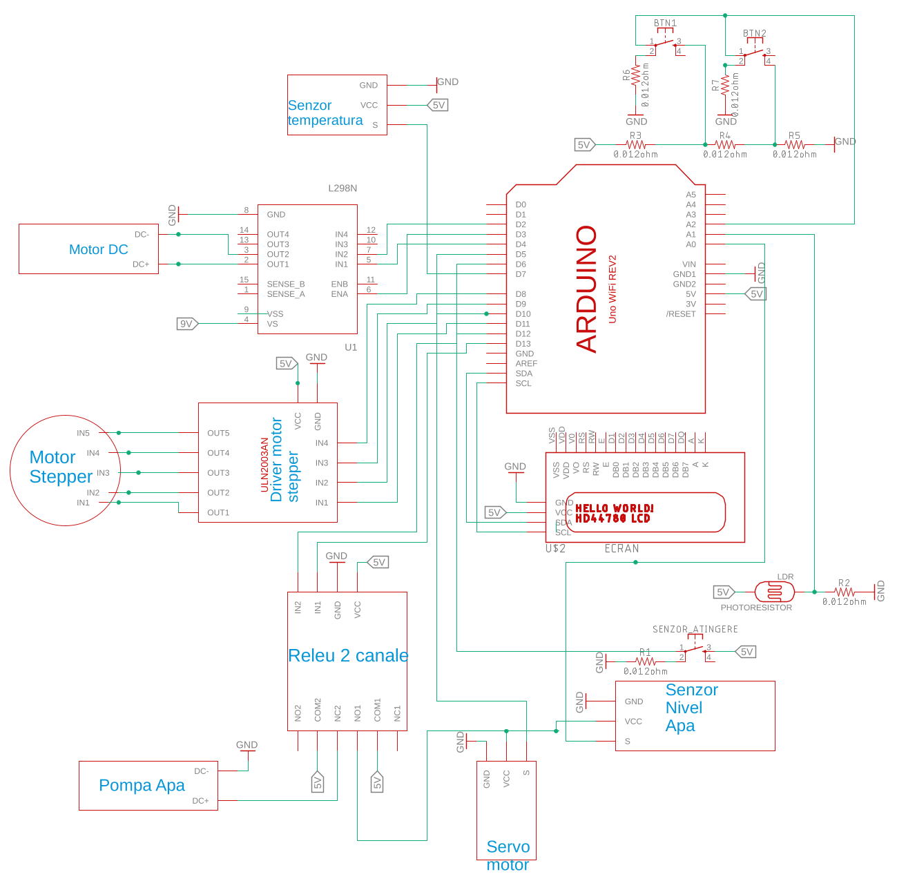 Codul este destul de simplu, am folosit biblioteci pentru ecran, modul de timp, servomotorul si senzorul de umiditate si temperatura. Am 2 butoane care sunt conectare la un singur port analogic cu ajutorul unui divizor de tensiune, astfel citesc ce se transmite pe portul analogic si stiu ce trebuie facut. Senzorul de nivel al apei si fotorezistorul sunt conectate tot pe porturi analogice astfel pot interpreta cum vreau datele citite. Motoarele DC sunt conectate cu ajutorul uni driver LN298N, astfel incat unui motor ii controlez viteza cu ajutorul scrierii analogice pe un port digital, PWM. Pentru dozatorul de mancare am scris secvente scurte de mers fata spate pentru a agita mancare astfel sa cada in bol. Pompa de apa este controlat de un canal al releului, iar alimentarea servomotorului si a senzorului sunt conectate de celalalt canal, astfel mai intai alimentez servo si senzorul care analizeaza daca trebuie pornita pompa. De-a lungul utilizarii am adaugat si alte mesaje pe ecran, iar daca putonul de mancare este tinut mai mult apasat poate aparea pe ecran timpul curent.