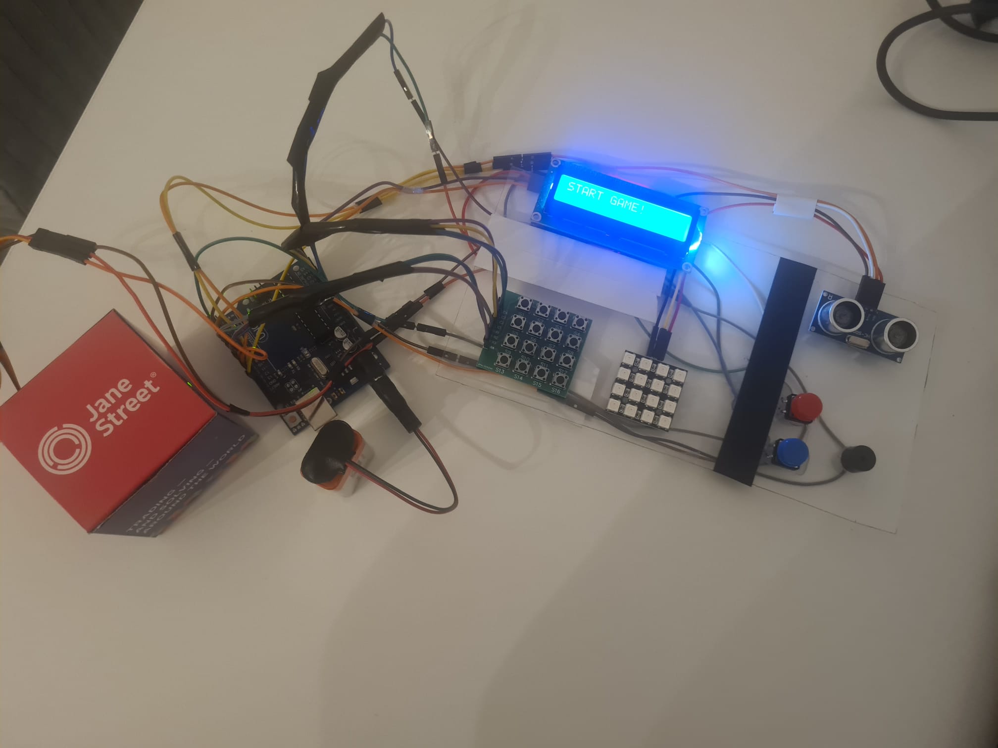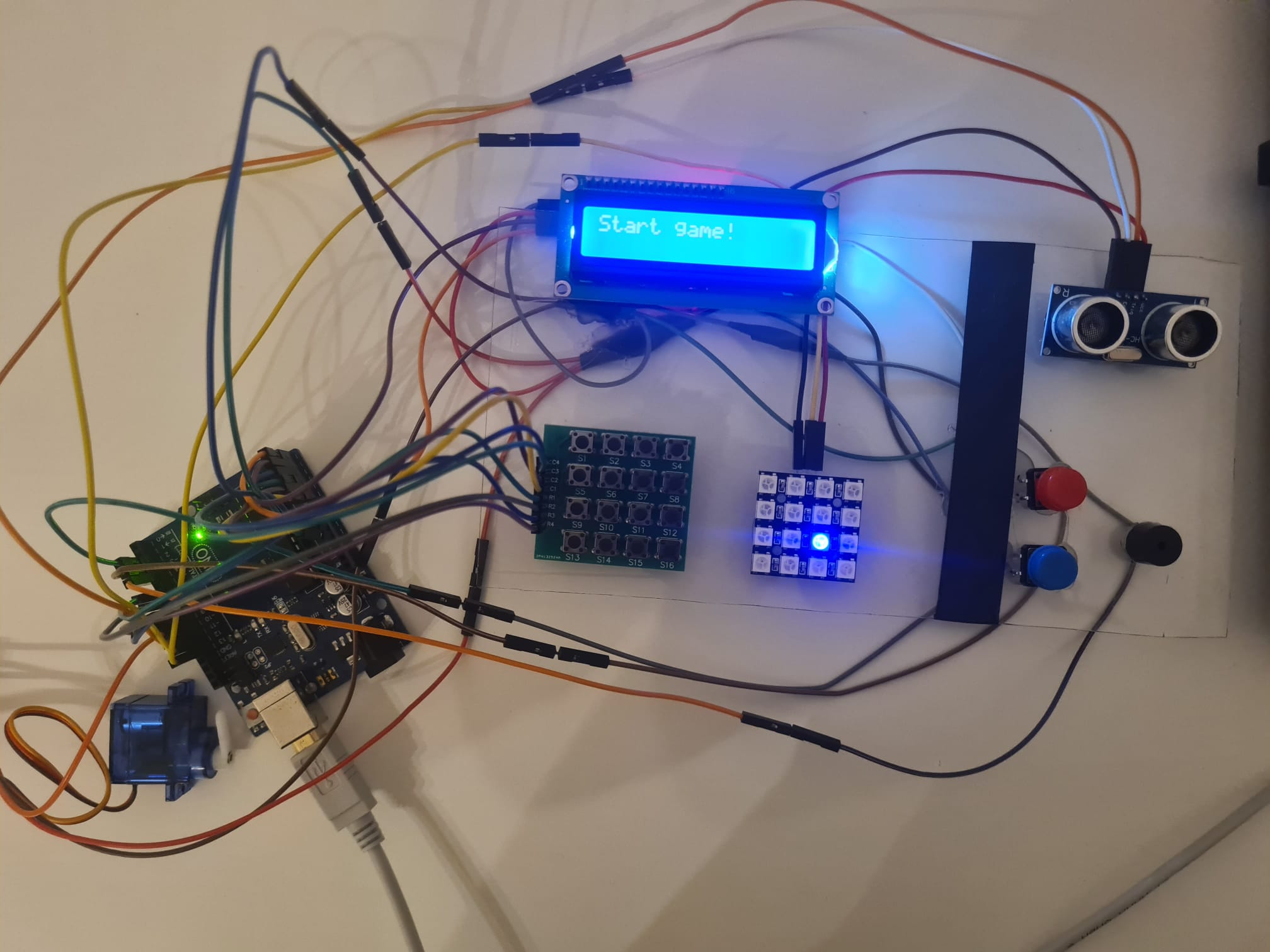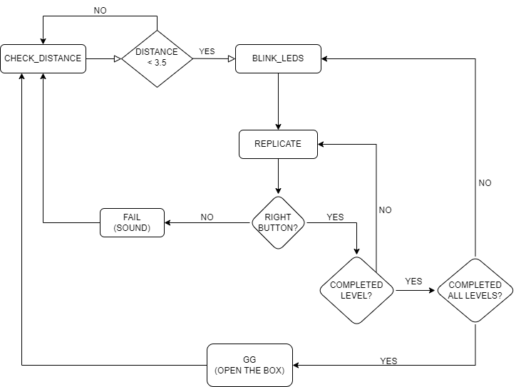 Se porneste din starea CHECK_DISTANCE, care este practic o stare idle, in care actioneaza doar senzorul de distanta pentru a detecta daca exista cineva in apropiere (ca in jocurile din AmongUs unde trebuia sa apropii mana pentru a da start). Functiile principale pentru aceasta sunt read_distance() si get_average_distance(), aflate in Distance_sensor.cpp. Pentru ca citirile mai dadeau si fals pozitive de genul: distanta 1 sau 0 chiar daca nu era nimic prin apropiere, a trebuit sa ma ocup de calibrarea acestuia. Am decis sa calculez media a 10 masuratori consecutive (facute la cateva milisecunde una de alta) inainte de a considera o valoare “pe bune”. Abia apoi, daca distanta este si in cazul acesta de cativa cm, pornim jocul propriu-zis.