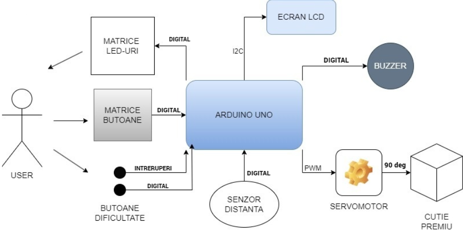 In timp ce este randul user-ului, acesta poate decide sa scada sau sa creasca dificultatea pentru rundele urmatoare, apasand pe cele 2 butoane aditionale, care trimit semnal microcontroller-ului.