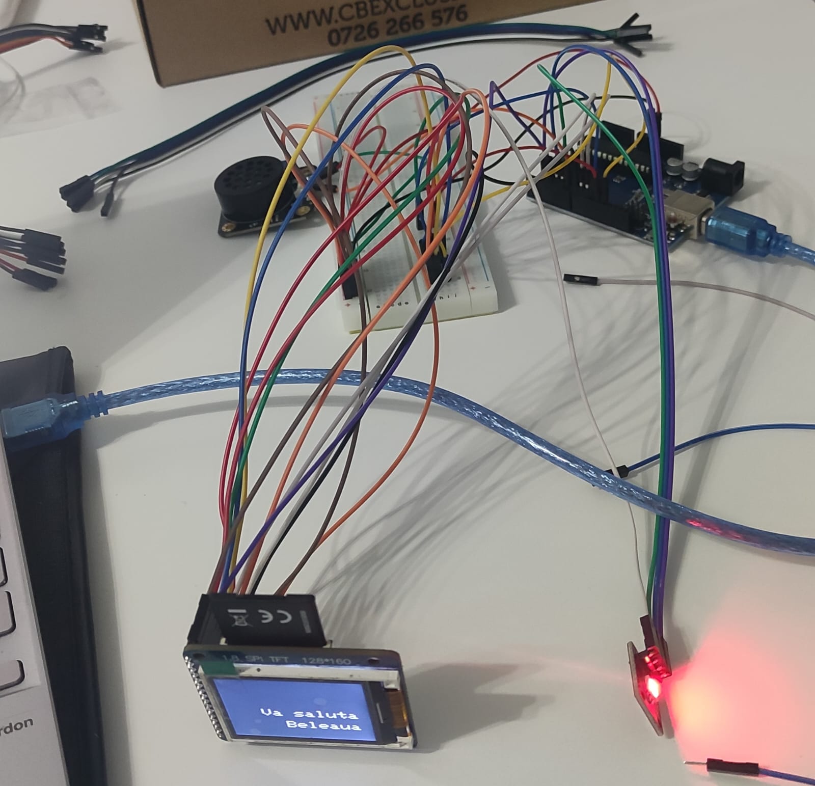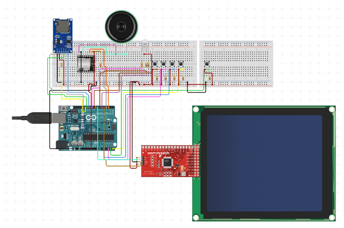 Voi folosi un Arduino Uno pe post de unitate de procesare, la care voi atasa un ecran de 1.8” LCD pentru a afisa jocul, un speaker pentru a canta melodii si 5 butoane pentru a controla cele 4 directii (sus, jos, stanga, dreapta) + buton de start. Ecranul vine si cu un adaptor SD prin intermediul caruia care voi afisa imagine de start. La final ma voi folosi de un LED RGB pentru a afisa finalul (RED - pierdere, BLUE - castig).