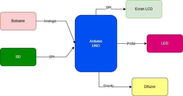 • Butoanele - cele 5 butoane vor fi conectate la accelasi pin analogic A0, folosindu-ma de ADC pentru am-mi da seama ce buton este apasat.
