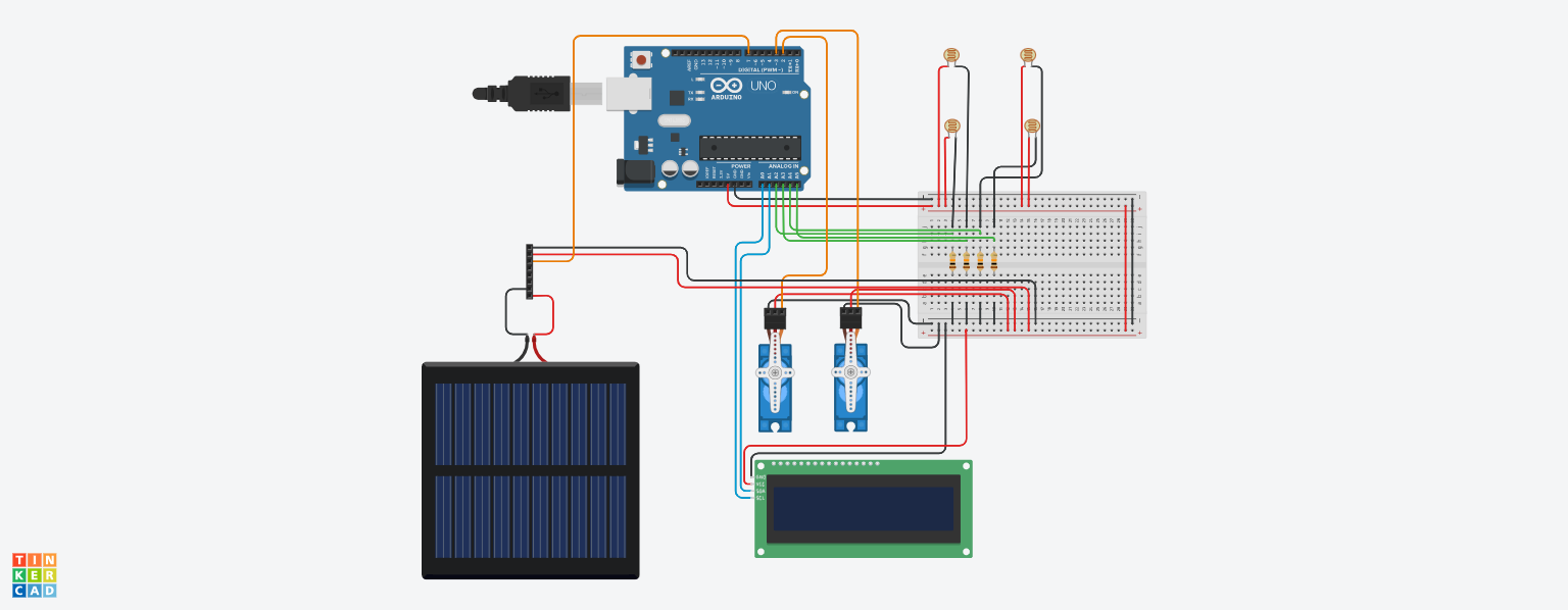 Pentru realizarea proiectului, se folosește un Arduino UNO care controlează două servomotoare SG90 pentru orientarea panoului solar pe două axe. Patru foto-rezistoare (LDR) sunt montate în colțurile panoului și conectate prin divizoare de tensiune cu rezistențe de 10kΩ pentru a detecta direcția luminii. Valorile analogice citite sunt procesate pentru a orienta panoul spre cea mai puternică sursă de lumină. Ecranul LCD 16×2 cu interfață I2C afișează informații despre poziția curentă și intensitatea luminii. Alimentarea este asigurată de un panou solar conectat la un senzor de curent ACS712, pentru a monitoriza energia produsă. Toate componentele sunt montate pe o placă de test (breadboard) și alimentate fie prin USB, fie direct de la panoul solar.