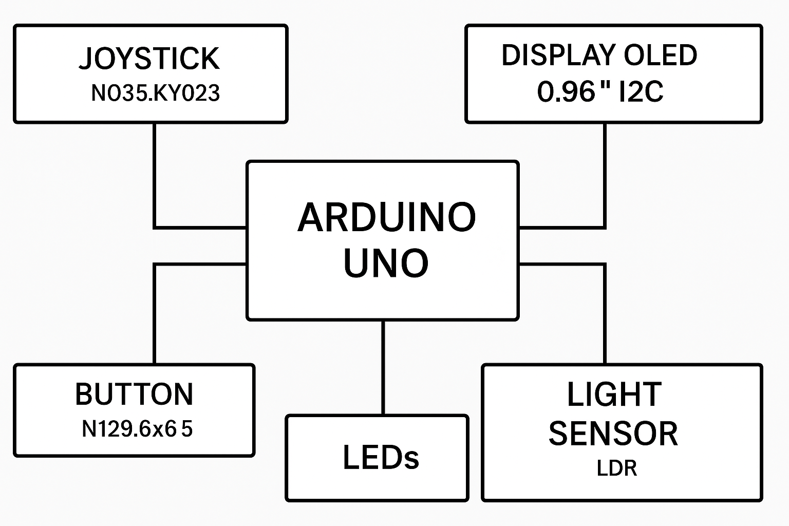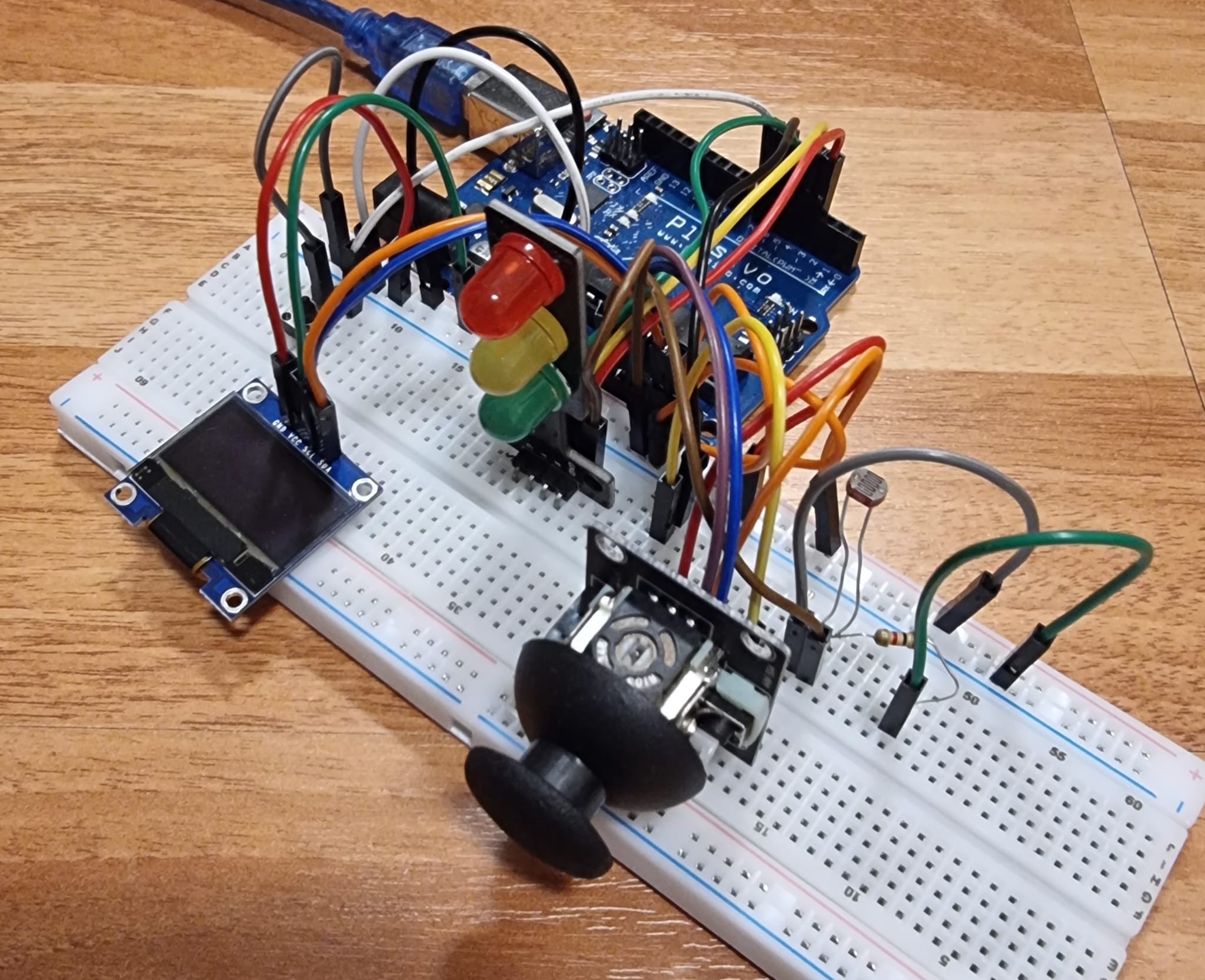 Am realizat un joc de tip breakout pe un ecran OLED folosind Arduino. Am folosit un fotorezistor pentru a detecta luminozitatea ambientala, astfel incat afisajul sa se adapteze automat la conditiile de iluminare, fie in modul intunecat, fie in modul deschis. Controlul paletei se face prin joystick, iar butoanele imi permit sa pun jocul pe pauza sau sa il resetez. Logica jocului include detectarea coliziunilor mingii cu zidurile, paleta si caramizile, iar eu urmaresc reducerea vietilor si determinarea castigatorului sau invinsului. Am folosit intreruperi pentru butoane si timer pentru delay-uri, ceea ce imbunatateste functionalitatea si raspunsul sistemului. Prin acest proiect am vrut sa creez o experienta interactiva si distractiva.