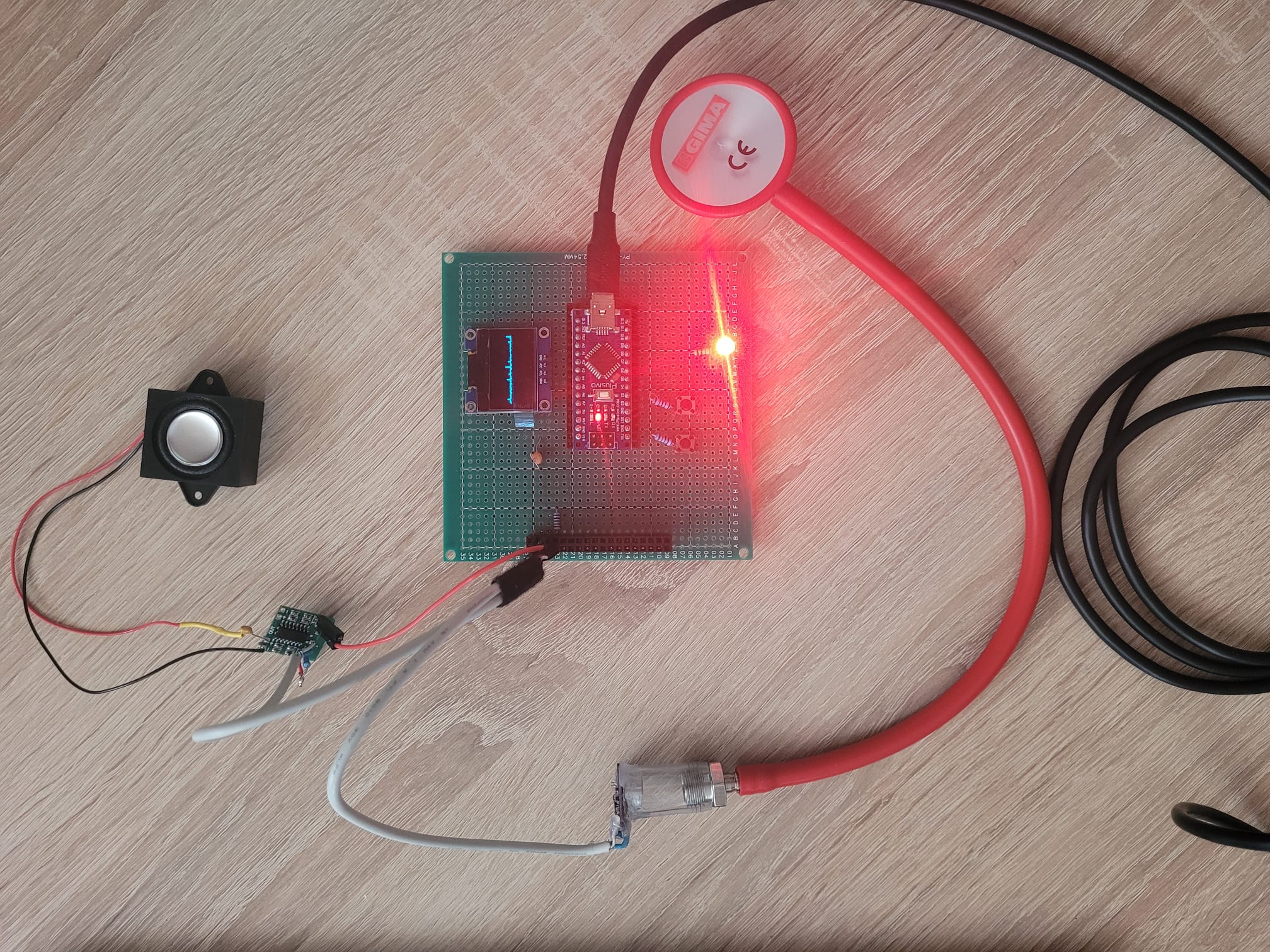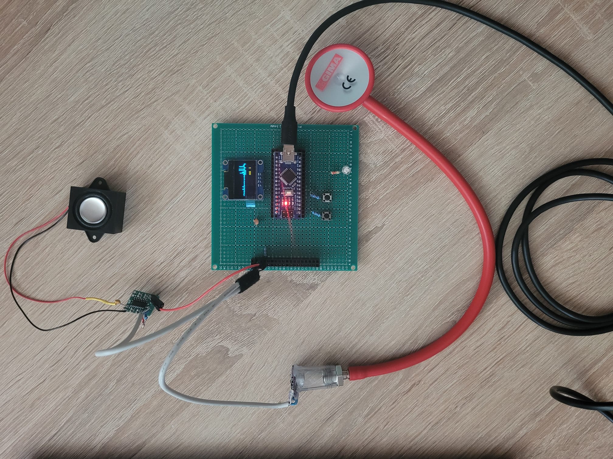 Proiectul propune realizarea unui stetoscop digital, capabil să capteze sunetele corpului uman prin intermediul unui microfon de înaltă sensibilitate. Utilizatorul va putea începe sau opri înregistrarea prin intermediul unui buton, iar starea va fi indicată de un led RGB. Cât timp înregistrarea este pornită, pe ecranul OLED va fi afișată reprezentarea grafică a semnalului captat de microfon.