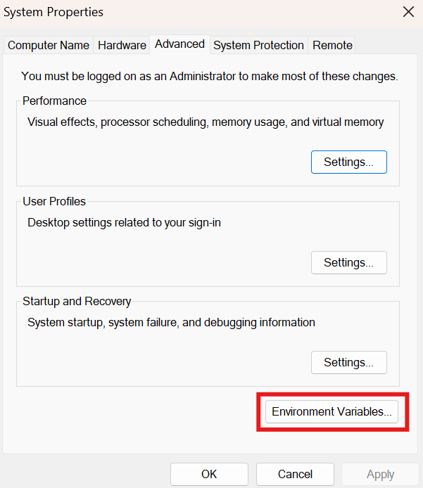 5. Se va deschide o fereastră intitulată System Properties și apăsați pe butonul Environment Variables: