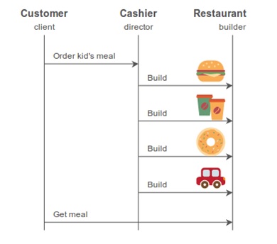 Acest pattern este folosit în restaurantele de tip fast food care furnizează meniul pentru copii. Un meniu pentru copii constă de obicei într-un fel principal, unul secundar, o băutură și o jucărie. Pot exista variații în ceea ce privește conținutul meniului, dar procesul de creare este același. Fie că la felul principal se alege un hamburger sau un cheeseburger, procesul va fi același. Vânzătorul le va indica celor din spate ce să pună pentru fiecare fel de mâncare, pentru băutură și jucărie. Toate acestea vor fi puse într-o pungă și servite clienților.