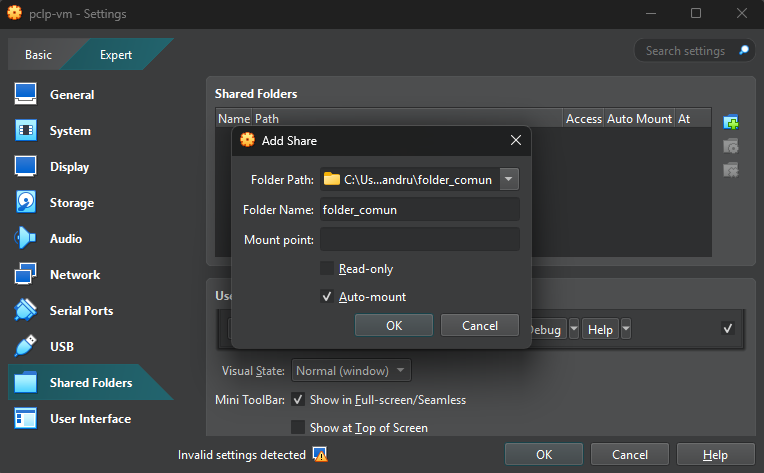 Pentru a ușura transferul de fișiere între host și mașina virtuală, vom crea un folder comun. Din setările mașinii virtuale, ștergem dacă este deja unul făcut când și facem un nou folder comun astfel: